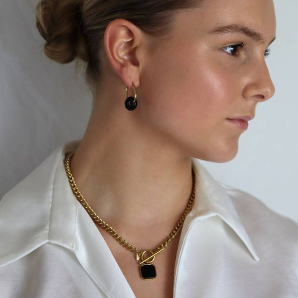 Hoe mooi is deze Chain Necklace With Square Stone? De ketting met zwarte steen is de perfecte combinatie tussen chic, feminine en vintage. Combineer de ketting met al onze andere sieraden voor een complete look! De ketting is gemaakt van stainless steel, dus is waterproof en verkleurt niet!