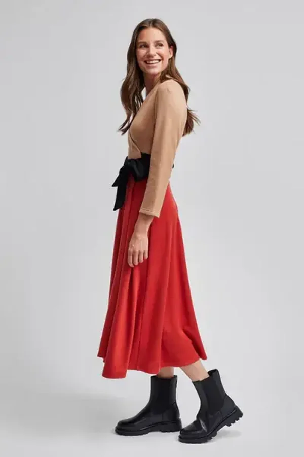 Herfstkleuren om te dragen: deze wikkeljurk in karamel en warm rood brengt licht in grijze dagen. De vrouwelijke snit met een vloeiend A-lijn model en zwarte strikceintuur accentueert stijlvol je taille. De zachte gebreide top omsluit je figuur, terwijl de rok losjes valt en met je meebeweegt.