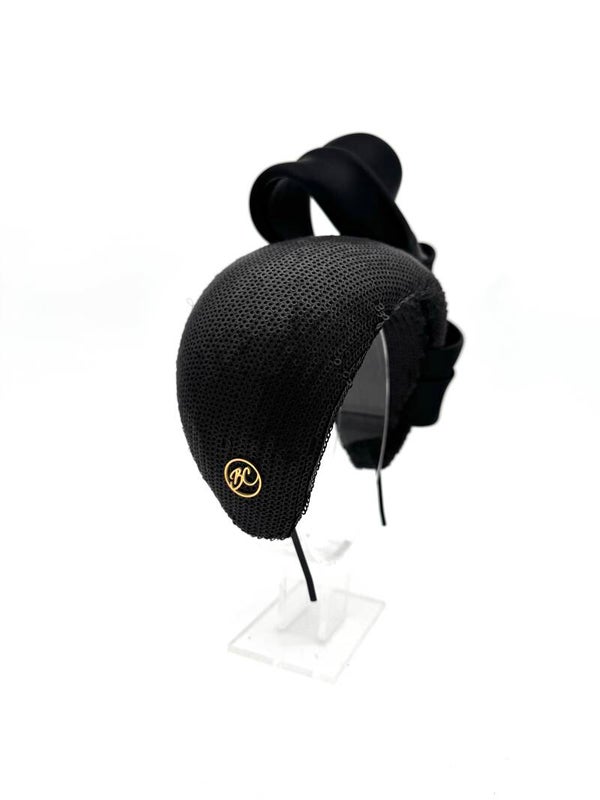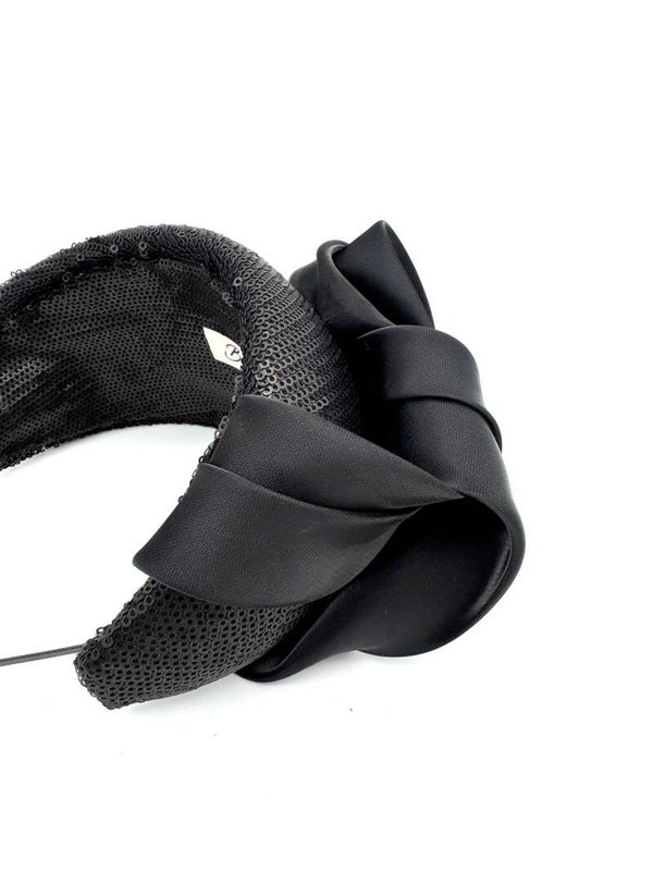 Bandeau 'Chloé' is een brede haarband in een uitvoering van een exclusieve, matte paillettenstof met een garnering in zware organza. De stof van de garnering heeft in het echt meer glans dan de foto weergeeft.