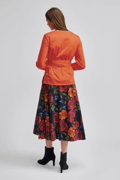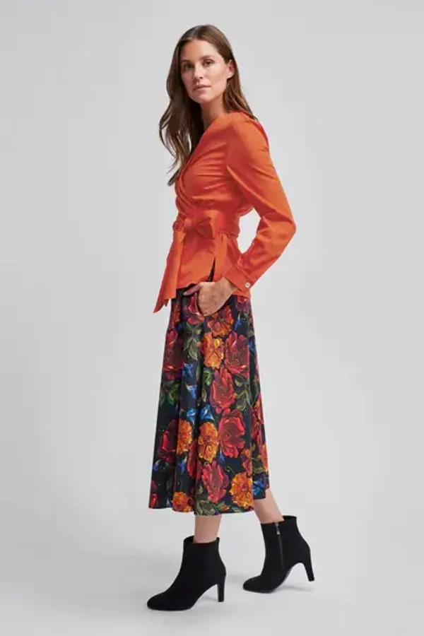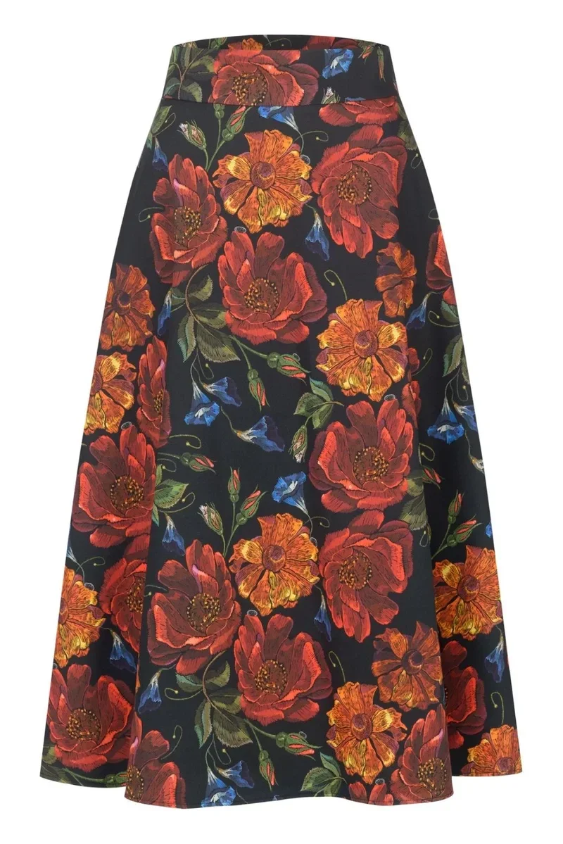 Opvallende bloemen in rood, oranje en blauw schitteren tegen een diepzwarte achtergrond – een rok die in het oog springt en persoonlijkheid uitstraalt.